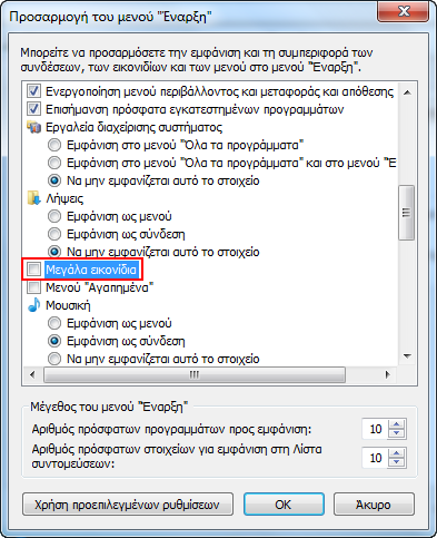 Μέγεθος εικονιδίων στο μενού Έναρξη